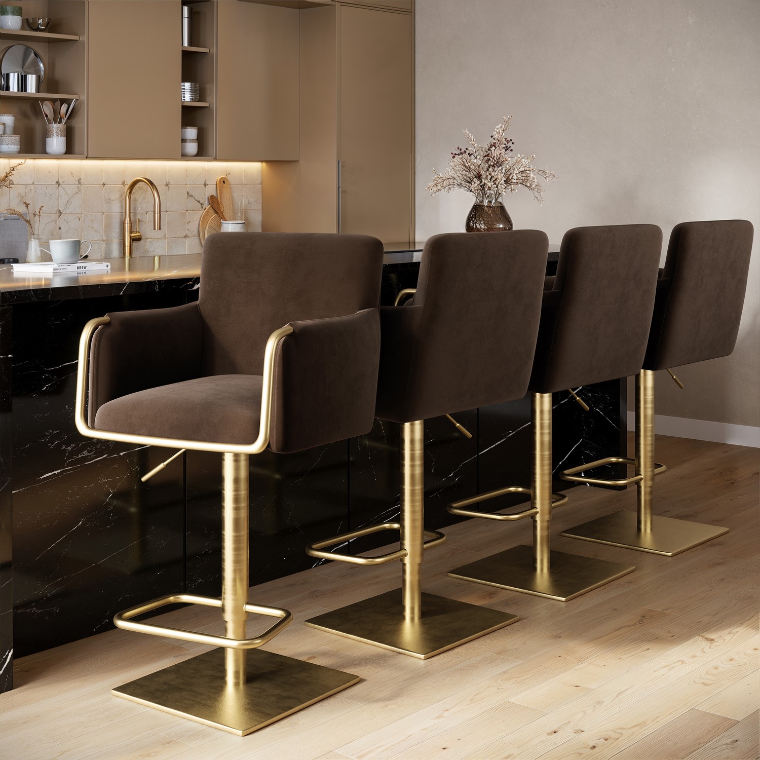 Luxurious Upholstery: Crafted with soft brown velvet, this barstool adds a warm and elegant touch to any space.