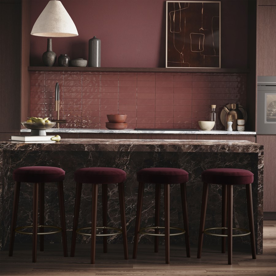 Plush Cushioned Seat: A cushioned seat and a soft rich burgundy velvet upholstery offers superior comfort while being a standout stylish addition to your kitchen.