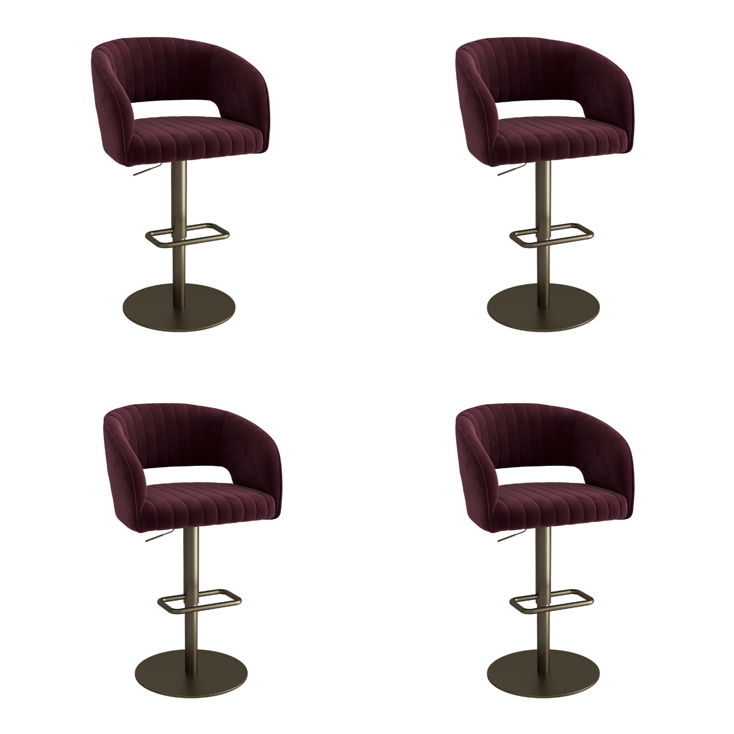 Add a touch of drama and sophistication to your kitchen or dining space with these Runa bar stools in burgundy velvet. The rich, jewel-toned upholstery is soft to the touch and beautifully detailed with vertical stitching, while the antique brass base creates a warm, vintage-inspired contrast. With 360° swivel and adjustable height features, this stool offers flexible seating whether you're entertaining or enjoying a quiet morning coffee. The curved backrest and generously cushioned seat ensure lasting comfort, while the streamlined pedestal design keeps your space feeling open and modern.