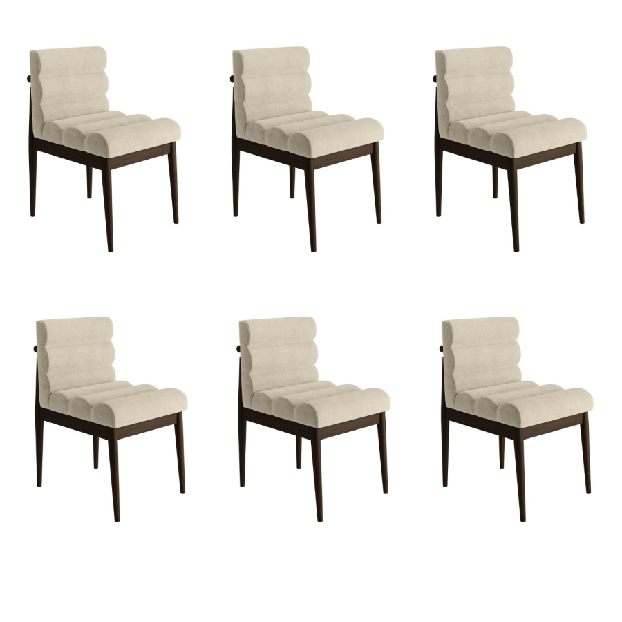 Bring refined style and comfort to your dining space with these beautifully crafted beige ribbed dining chairs. Upholstered in a soft beige fabric, the sculpted ribbed seat and backrest create a plush, inviting look while offering supportive comfort during every meal. The warm walnut stained rubberwood frame and tapered legs add a rich, natural contrast, giving the chair a timeless, mid-century feel. With its unique elegant silhouette, this chair makes a subtle statement in both modern and classic interiors, it brings warmth, sophistication, and everyday practicality to any home.