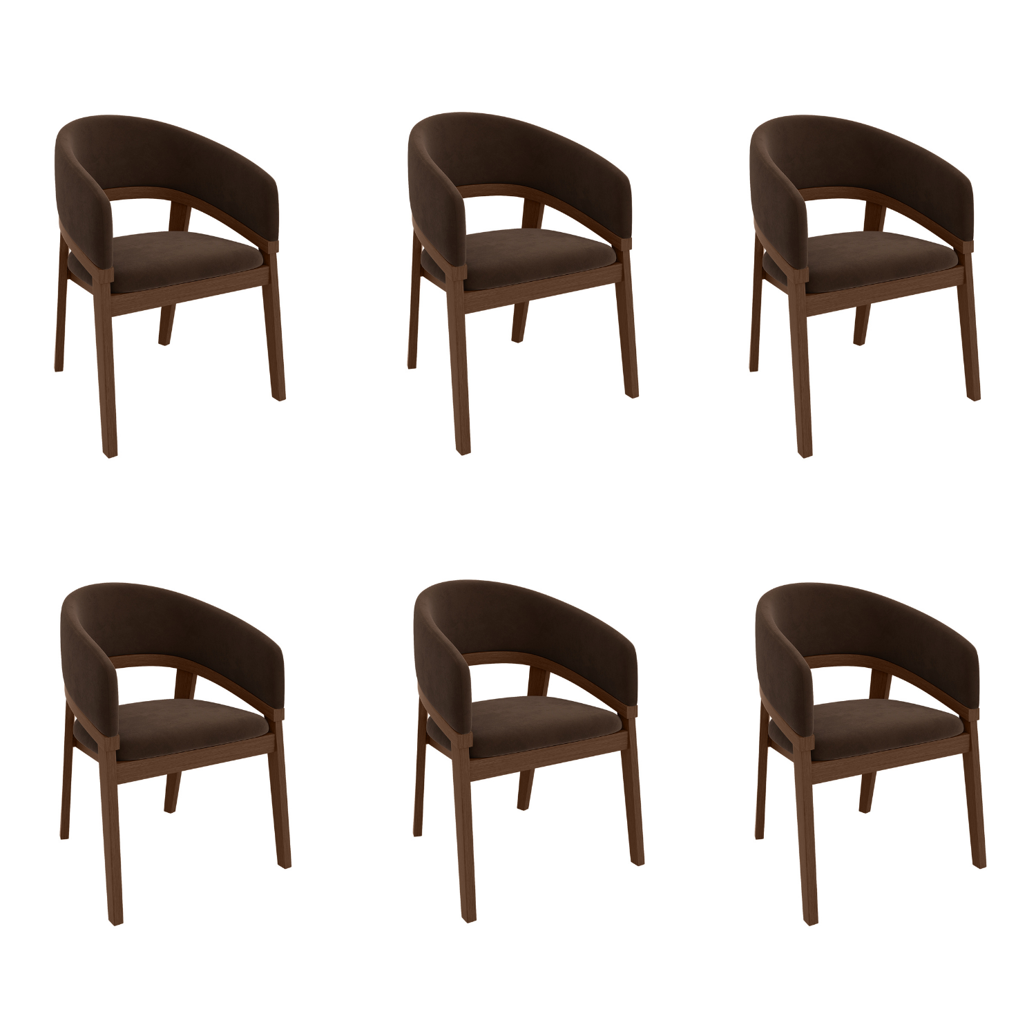 Upgrade your dining space with these curved dining chairs. Featuring an elegant cut-out and curved backrest design, these chairs blend modern sophistication with everyday comfort. The plush chocolate brown velvet upholstery and padded back and armrests are perfect for long dinners or casual gatherings. Built for durability, the solid wood frame with a walnut-stained finish adds warmth and stability, making these chairs a long-lasting addition to your home.