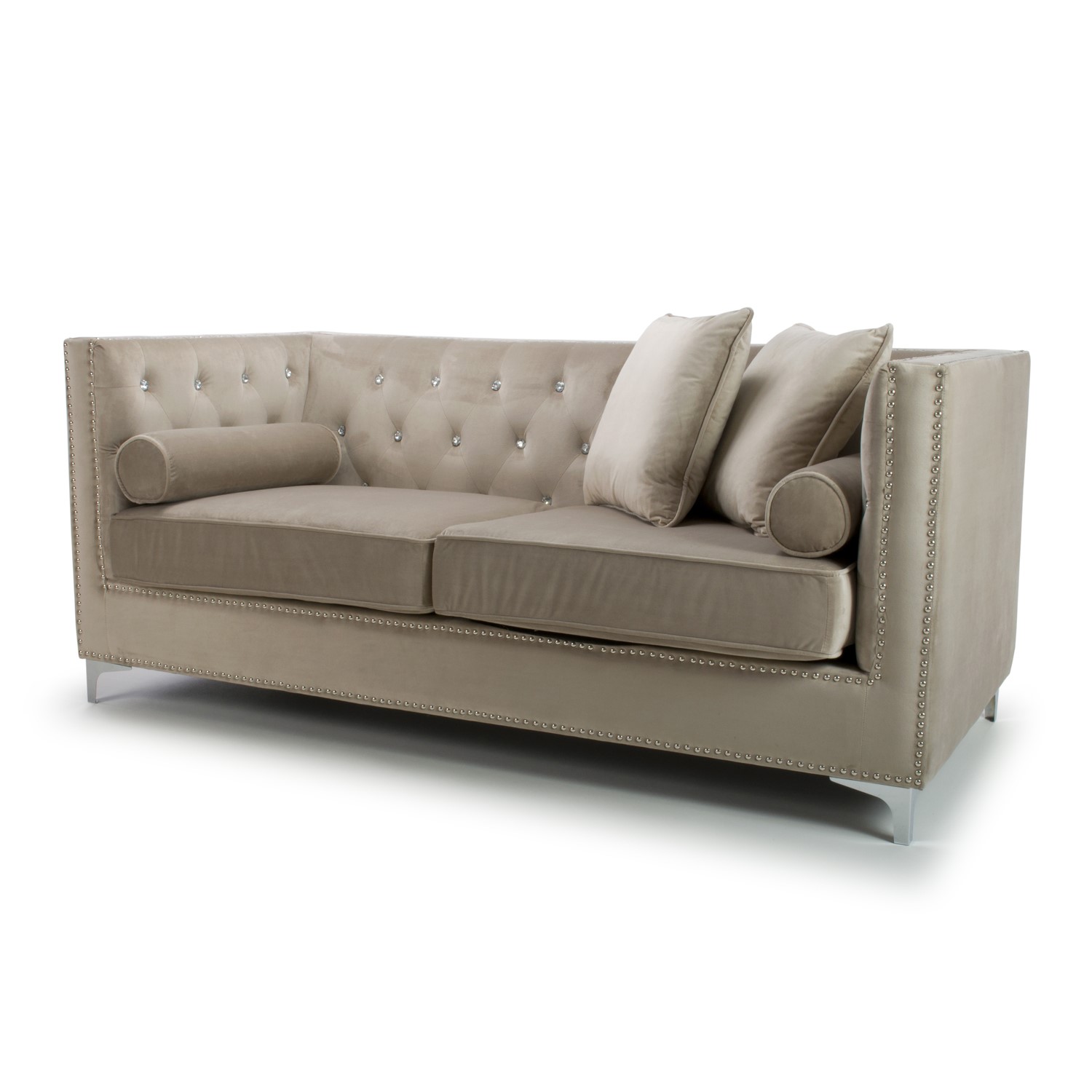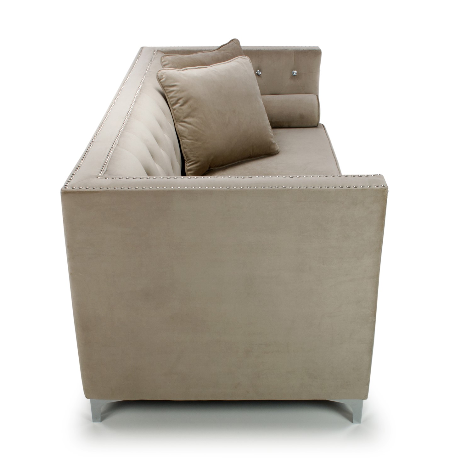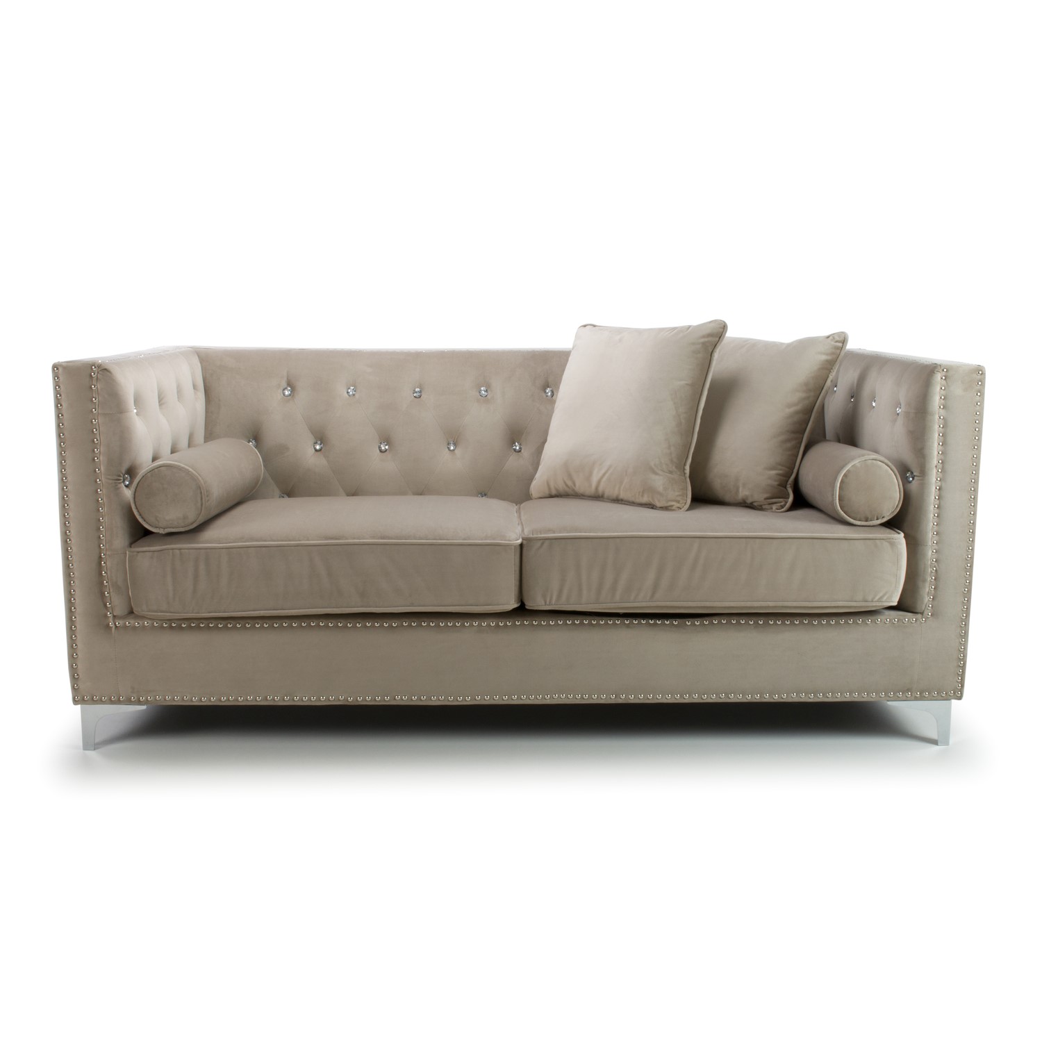 Part of a fabulous collection, this 3 Seater Sofa is designed to transform the interior look of any room. The range is full of charm and serenity with an emphasis on clean lines. This collection symbolizes style and is perfect for those who pride themselves on design. Mink Luxurious Brushed Velvet with Diamante buttons, stud detailing around the front, back and sides and finished with Polished Chrome Legs. The sofa comes complete with two cushions and bolsters. Also available in grey.