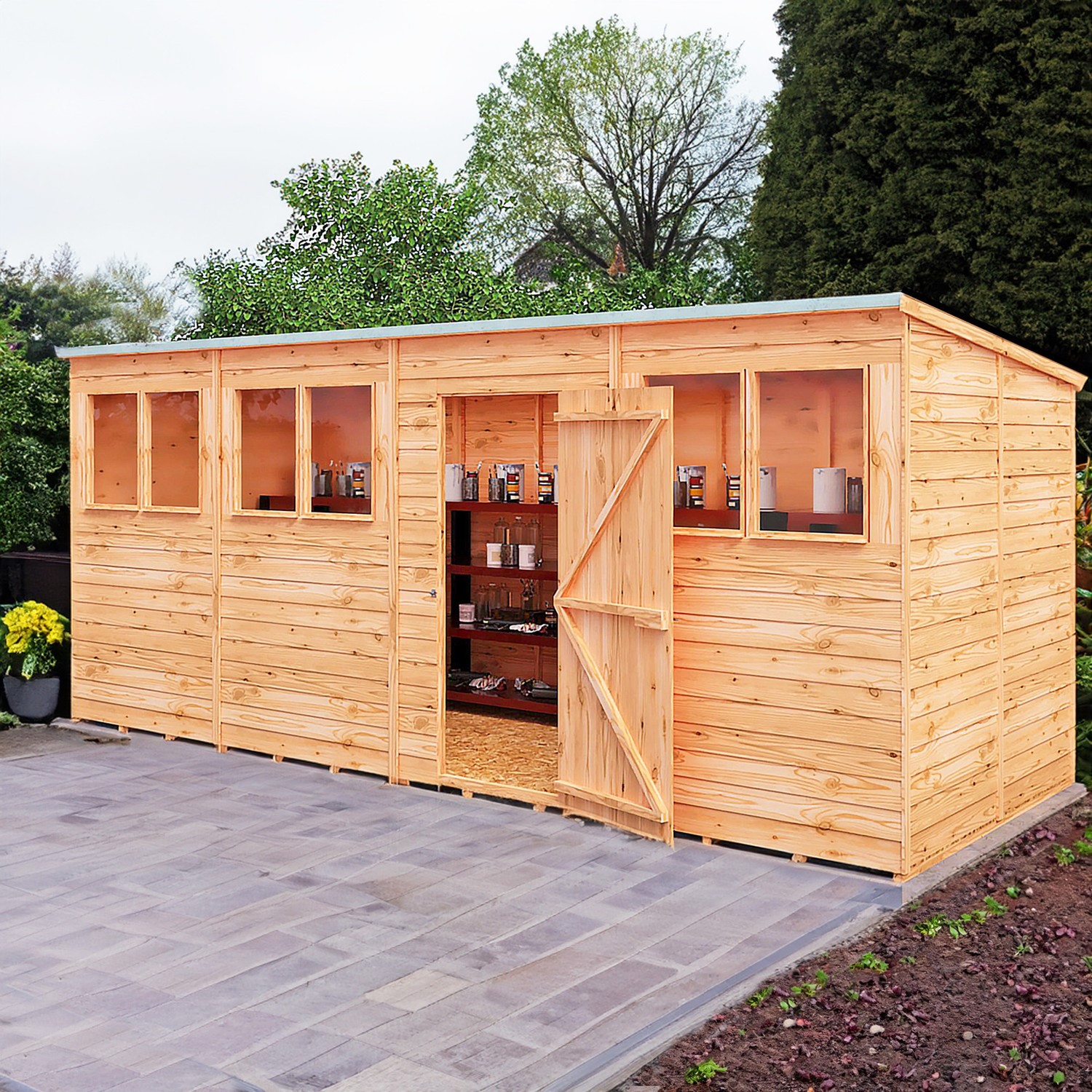 The Shire Garden Value 16 x 6 Overlap Pent Shed with Windows is designed to provide generous and practical outdoor storage while making efficient use of garden space. Its extended 16 x 6 ft footprint offers plenty of room for storing tools, lawn equipment, bikes, and other outdoor essentials, while the narrow depth allows it to sit neatly along a fence line or garden boundary. Constructed from traditional overlap timber boards, the shed delivers a classic garden look that blends naturally with outdoor surroundings. The pent roof adds a modern touch while helping rainwater run off effectively to protect the structure. Multiple windows bring natural daylight into the interior, making it easier to organise and access your stored items throughout the year.
