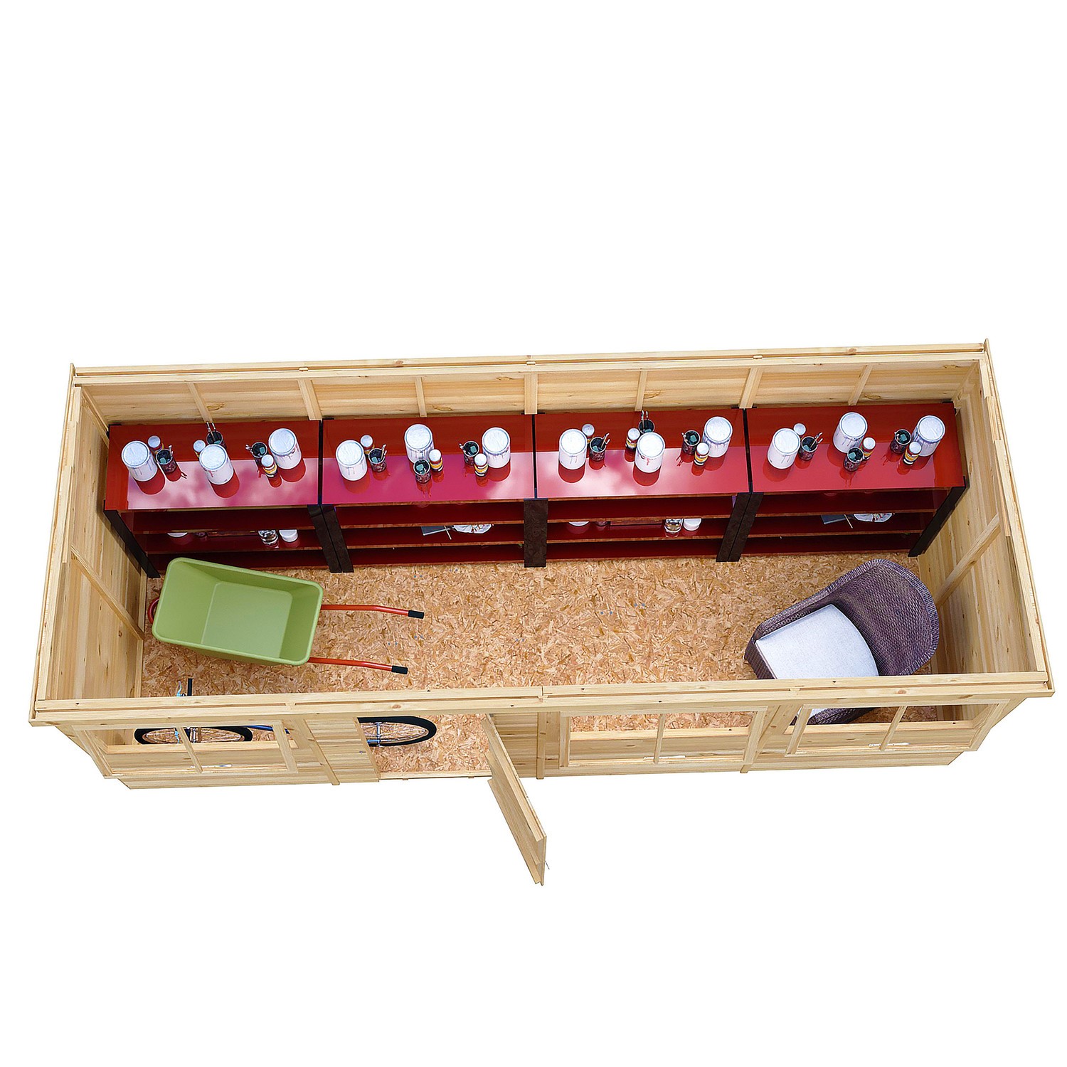 Bright Interior Space: A row of fixed windows allows natural daylight into the shed, making it easier to locate tools and use the space as a practical garden workspace.
