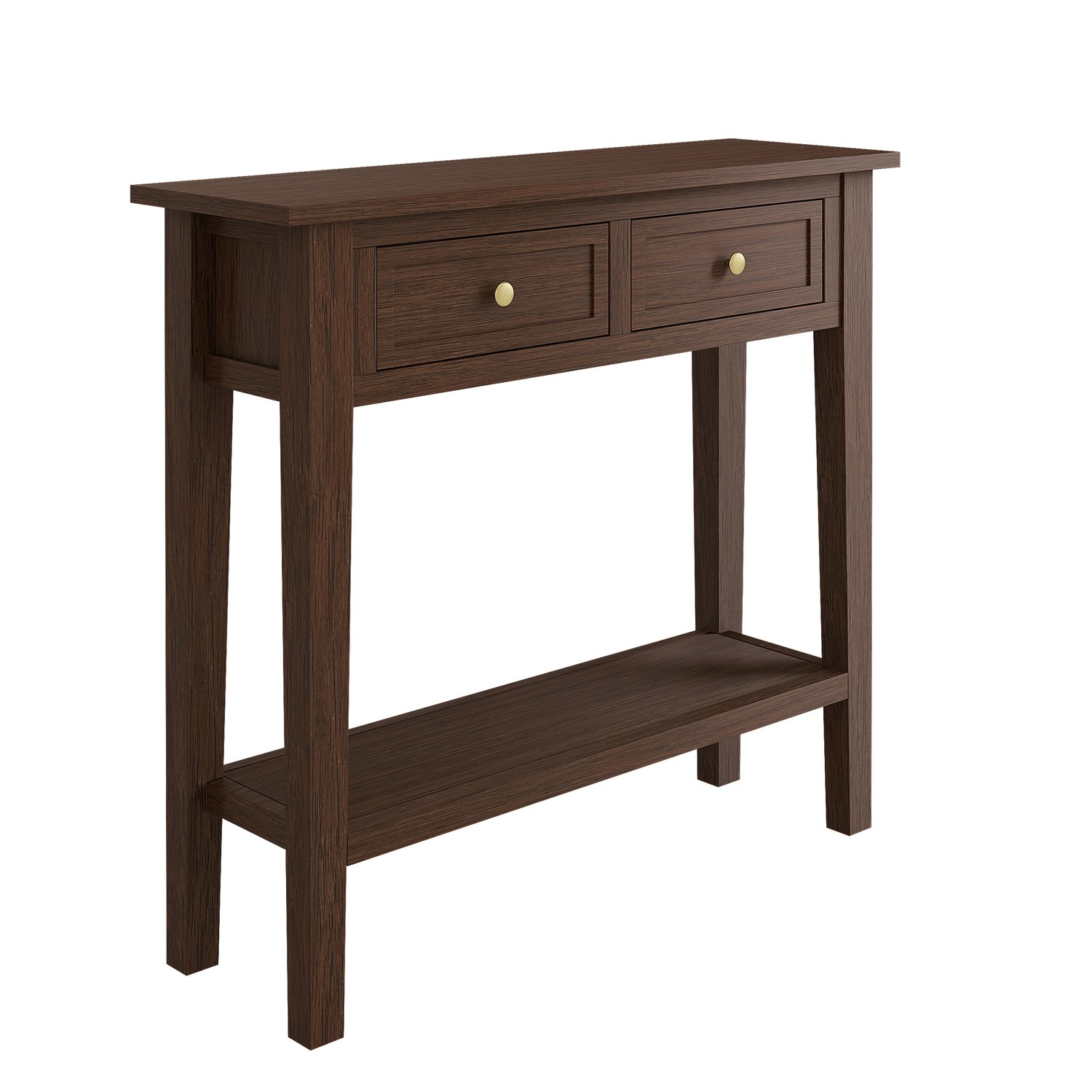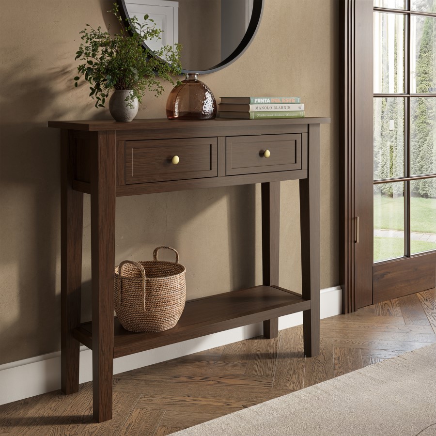 Maximise your space, and discover the perfect finishing touch for any hallway. This compact design console table has been beautifully finished in a walnut stain with two elegant handles, to complement any room themes and colour palettes. Pick and choose how or where you store your items across three levels of convenient storage; on the top, concealed behind drawers or on the lower shelf. Choose from silver and gold handles, giving you the flexibility to choose the handle colour that best complements your rooms aesthetic during assembly.