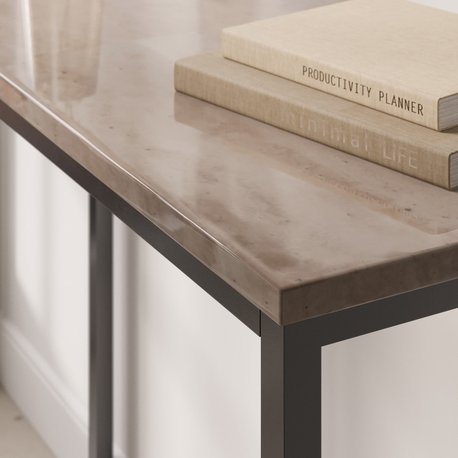 Bring both style and practicality to your home with the Demi console table. Its rectangular design features a beige travertine-effect top, beautifully contrasted by a pewter metal base for an industrial yet elegant aesthetic.
