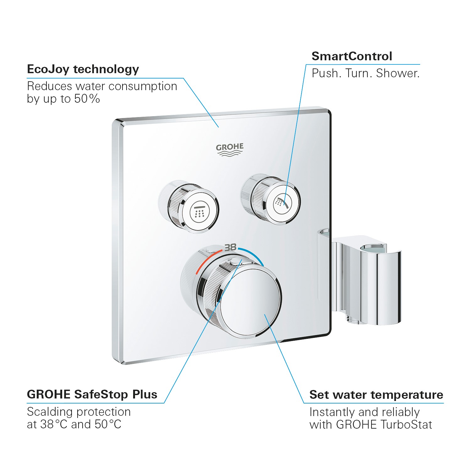 - GROHE SafeStop (Plus) – scalding protection at 38°C and (optional) 43°C