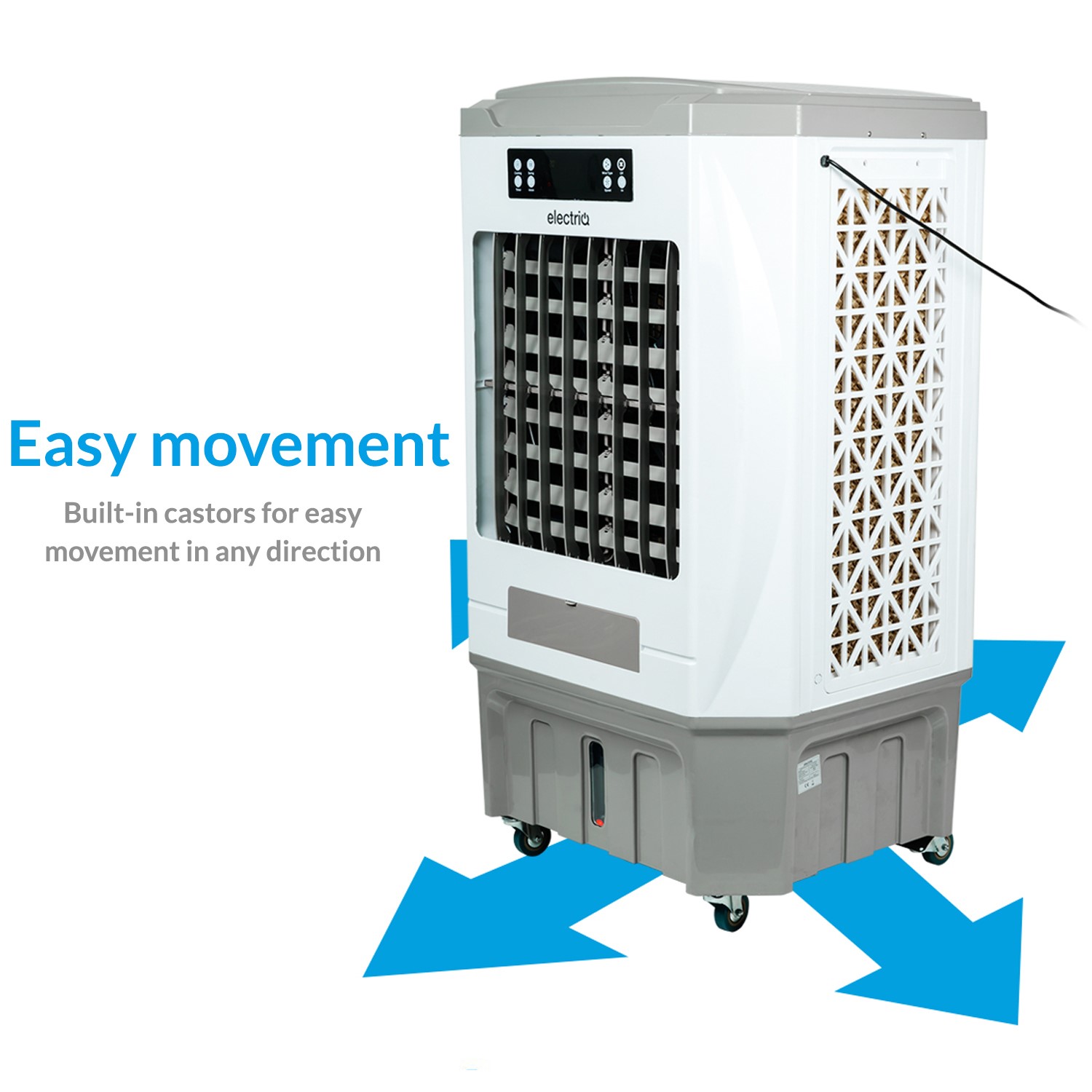 The Storm100E is an evaporative air cooler that cools the air by means of evaporation. When water evaporates into the air, the result is a mixture of air and water molecules. This chemical change requires heat which is taken from the water molecules, resulting in a spot cooling effect, the temperature drop. The air is passed through a special honeycomb cooling pad which expands the evaporation surface and improves the cooling effect while doubling as an air filter. The evaporative coolers must be used in rooms or spaces with good ventilation otherwise the room will get saturated with humidity and the effect of cooling will stop.