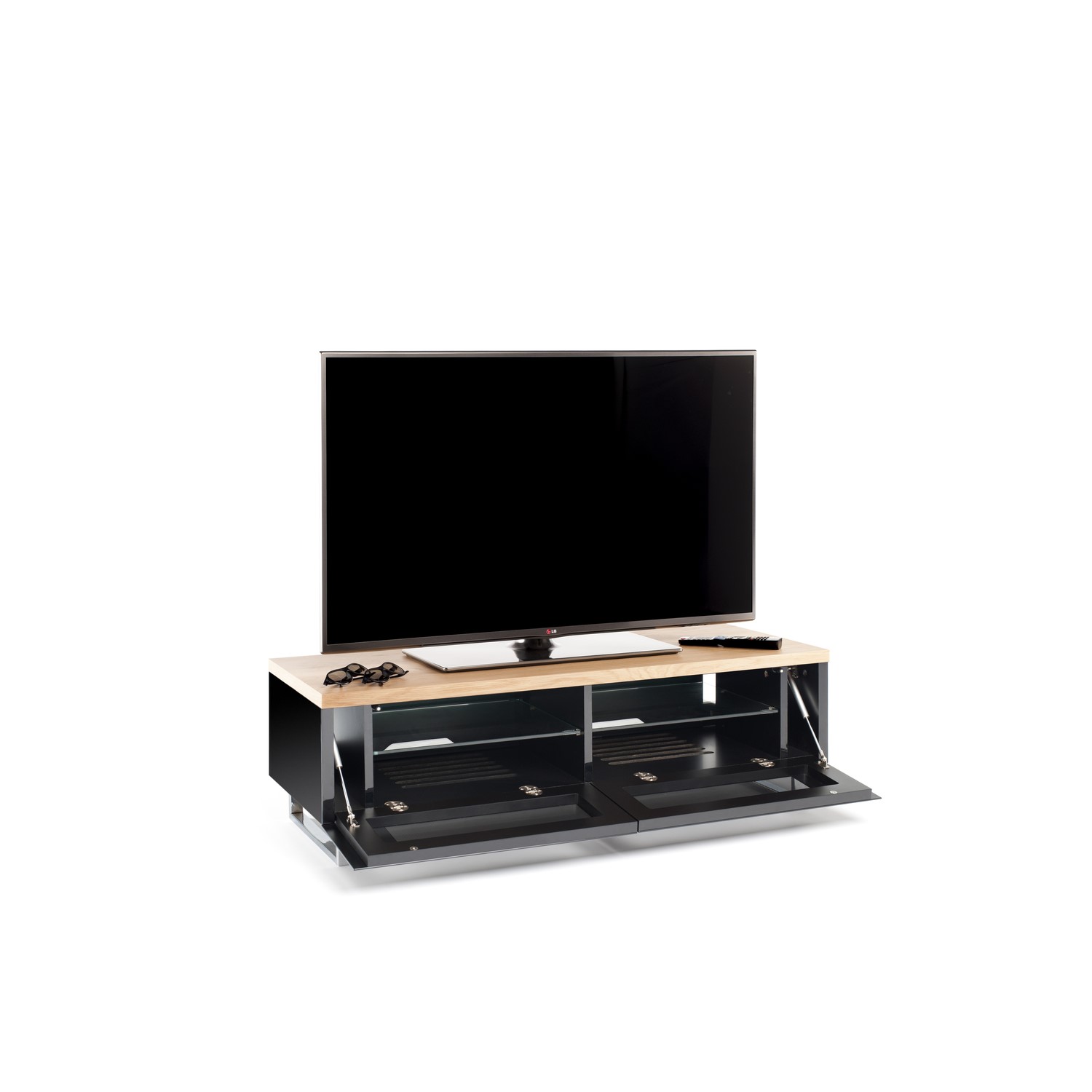 A statement of quality and understated elegance, Panorama caters for the largest screens and has ample storage space for a full range of ancillary equipment and accessories. Two drop down doors with IR pass through maintain the sleek, minimalist look.