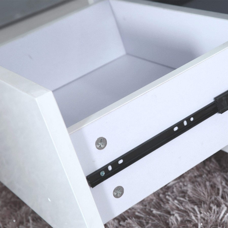 Constructed from a strong wood combination, finished with a smooth coating of fresh white, high gloss lacquer. The two discreet corner drawers have durable metal drawer runners. The table sits upon casters for easy movement.