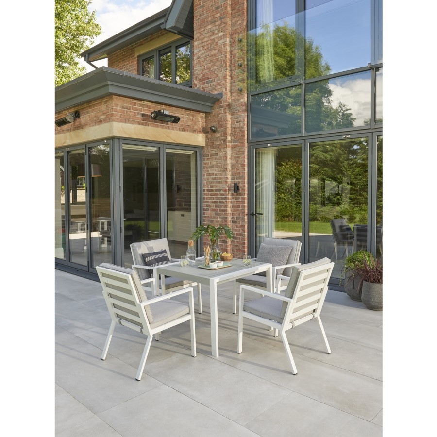 A lovely two-tone finish on the fining table softens the white finish and add a touch of luxury to this pretty dining set. A great place to relax of entertain throughout the summer months.