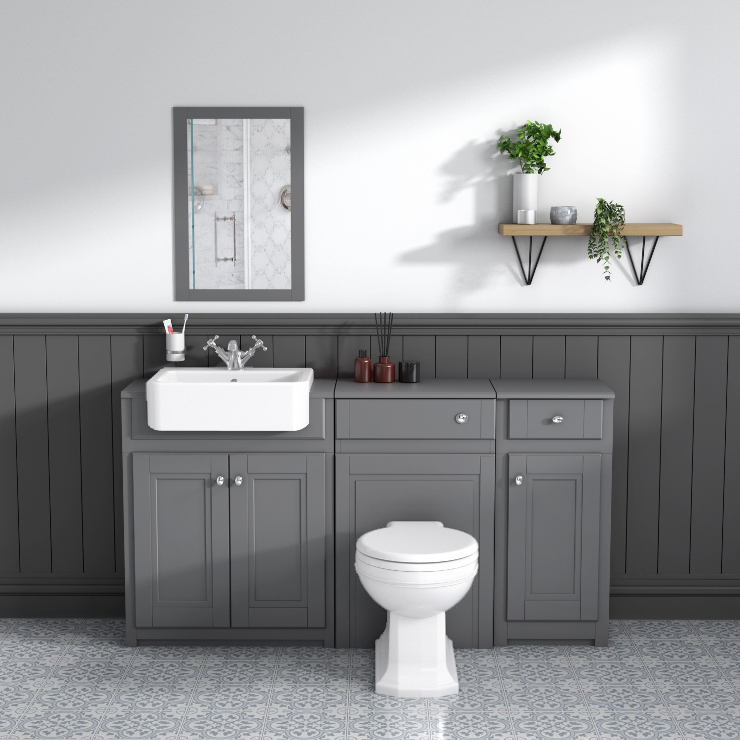 The Westbury traditional 600mm wide grey vanity unit with a glossy ceramic semi-recessed basin, WC unit and storage unit is the perfect transitional traditional combination unit. Both the doors and front fascias feature striking yet beautiful panelling design. The Westbury range of delightful bathroom furniture hosts classic styling with practical storage solutions and a WC Unit which hides all unsightly plumbing. The Vanity and Storage Unit features an internal shelf providing generous storage space for your toiletries, helping to keep your bathroom clutter free. To maximise the amount of basin space for washing the semi recessed basin protrudes from the unit but is designed to look more purpose fitted. Please note the Vanity Unit and Basin, WC Unit and Storage Unit can be fitted separately.