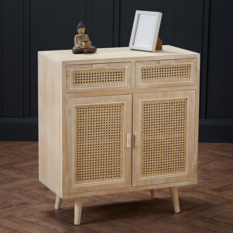 This stunning sideboard features a washed light oak effect finish, giving this piece a modern interpretation of a timeless design. Two spacious doors with on-trend ratting panelling hide two shelves on either side. Two drawers offer plenty of space for those smaller items and clutter, keeping them within easy reach.