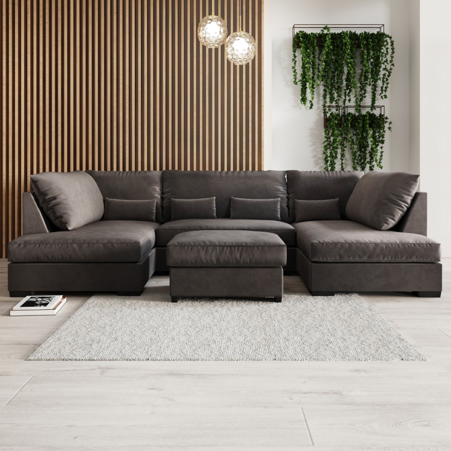 Create your perfect utopia with the Madison U shaped sofa. Comfortably seat the whole family for movie nights and never run out of space for extra guests. The mink velvet fabric and soft plush cushions offer just the right amount of support to help you relax. Still need more seating? The matching footstool adds that finishing touch to the set, as well as creates an additional seat.