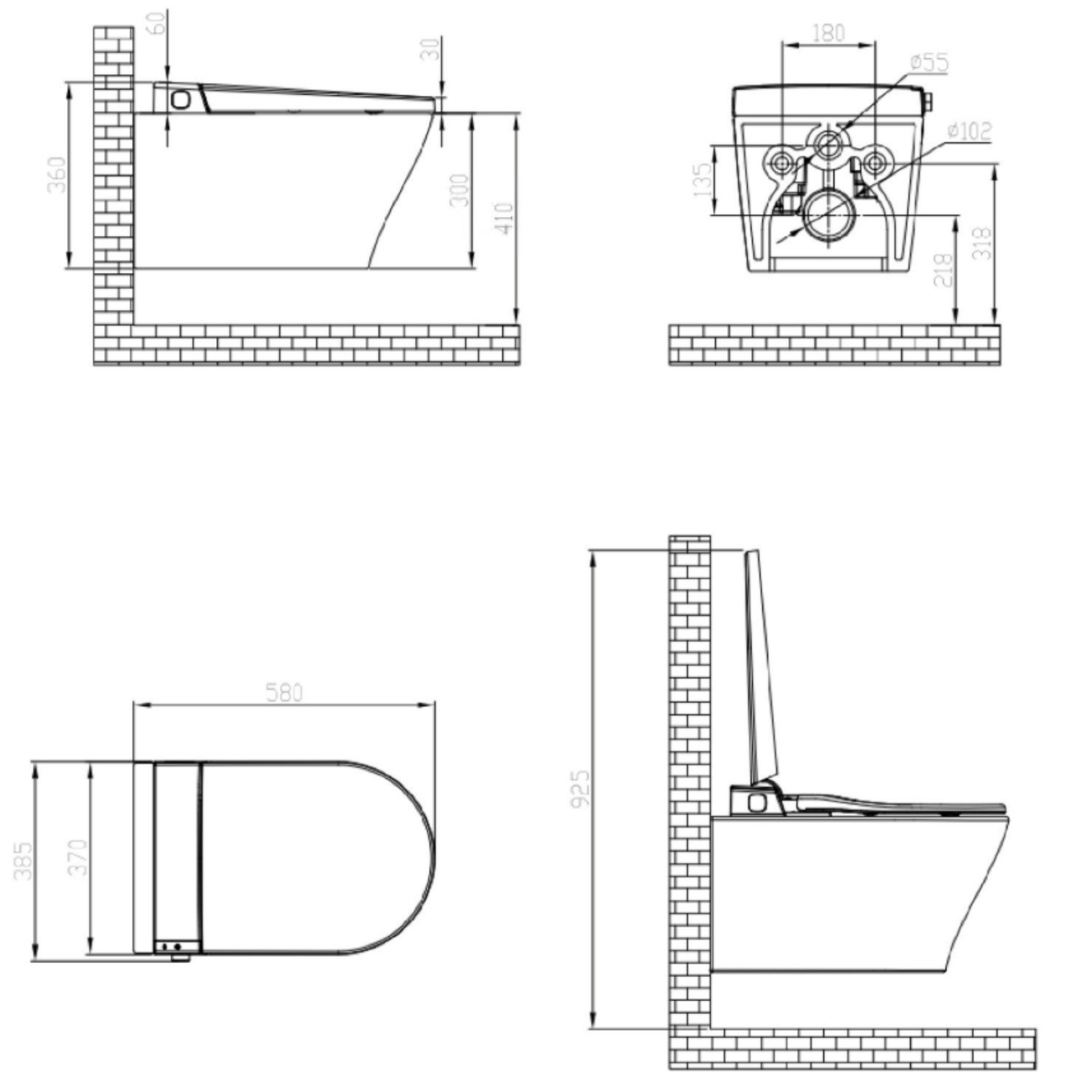 - Toilet dimensions: H360 x W370 (385 including dial controls) x D580 mm