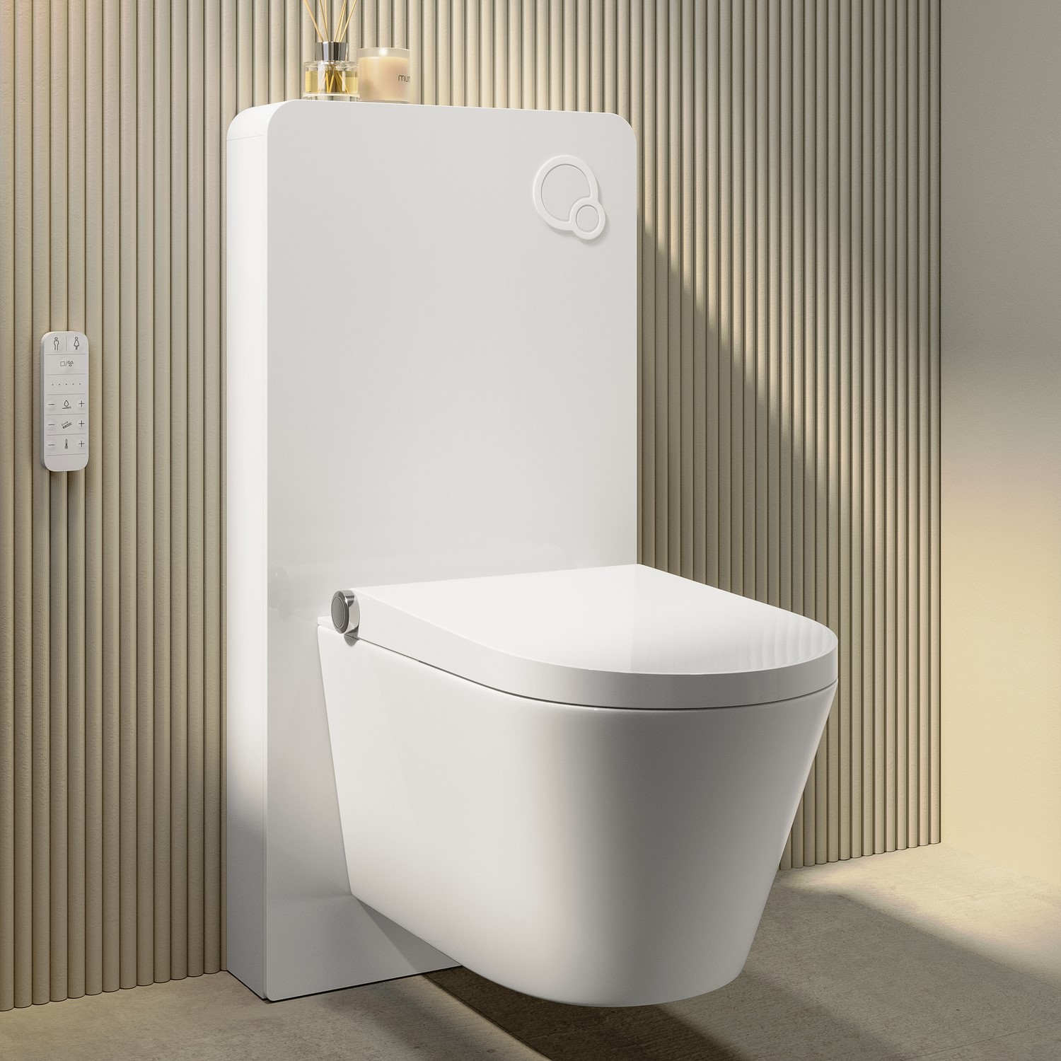 Upgrade your bathroom with the ultimate in comfort and design—this Wall Hung Smart Toilet Pan and Gloss White Cistern Cabinet combo is built for convenience, hygiene, and crisp modern style. The toilet features a heated seat, smart sensor lid, and a fully customisable wash and dry system with options for water temperature, pressure, and massage—all controlled from a magnetic wall-mounted remote or on-seat buttons.