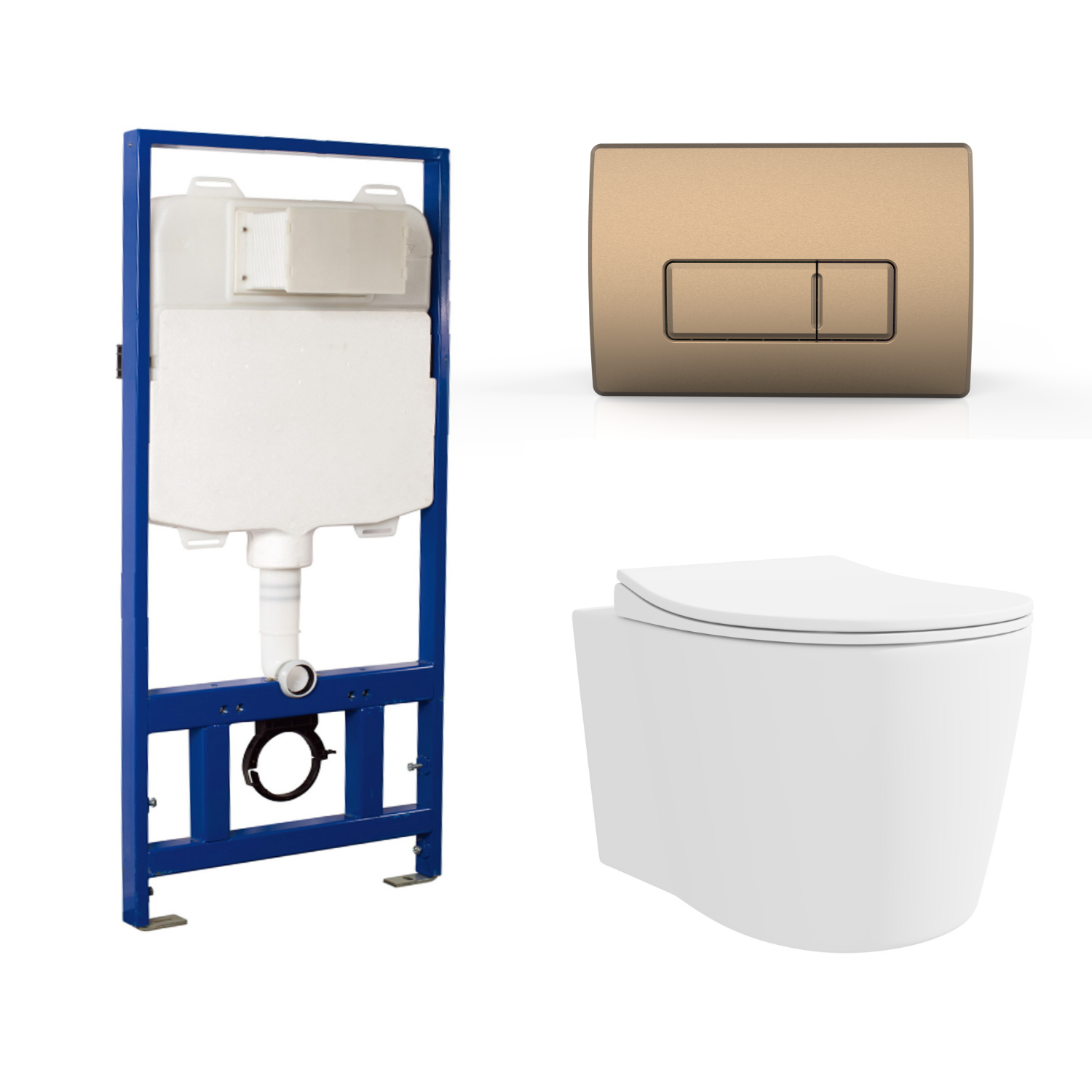 Transform your bathroom with the sleek and modern Alcor wall-hung toilet and Elira Pneumatic Brushed Bronze Flush Plate. The Alcor toilet features a round design with a gloss white finish, perfect for a range of bathroom styles, from compact cloakrooms to spacious en-suites. Its rimless design enhances both cleanliness and water efficiency, while the soft-close seat ensures comfort and quiet. The wall-hung design saves floor space, giving the effect of a floating toilet with all pipework hidden for easy cleaning. Pre-assembled for quick installation, this toilet provides a clean, contemporary look.