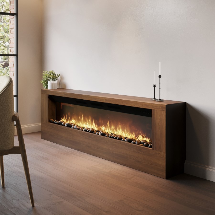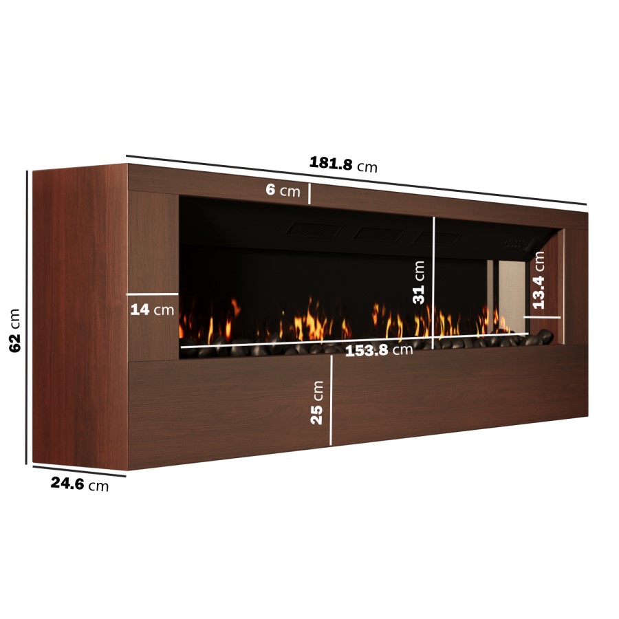 - What’s included: 1 x wall-mounted fire, remote control, black pebbles and fixings
