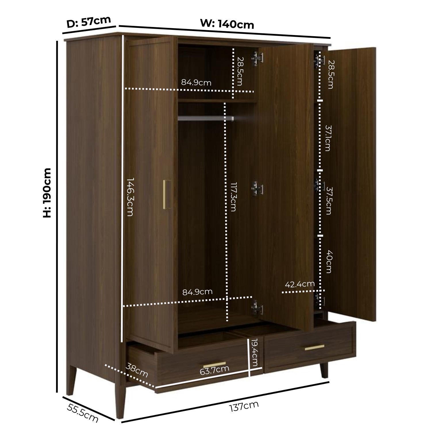 - Storage: 2 wardrobe compartments, 2 drawers