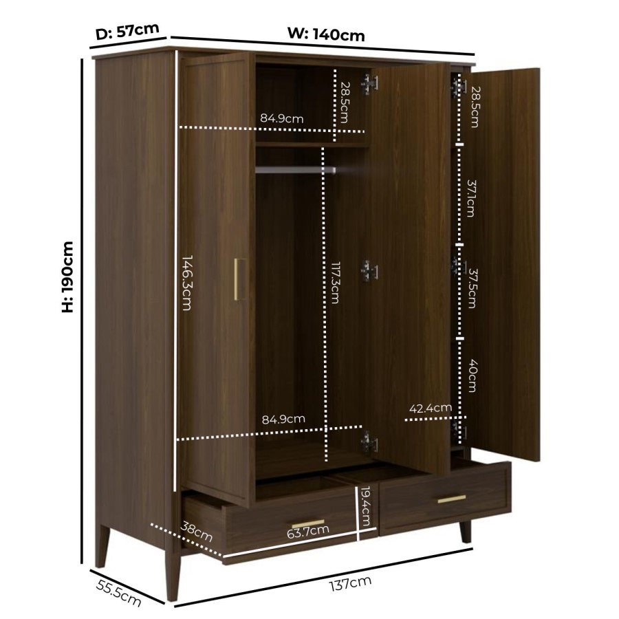 The Delilah Walnut 3 Door Wardrobe is a beautifully crafted storage solution, designed to bring timeless elegance and practical functionality to your bedroom. With three full-height doors and two large drawers, it offers a generous mix of hanging and folded storage, helping you keep everything from coats to knitwear in perfect order.