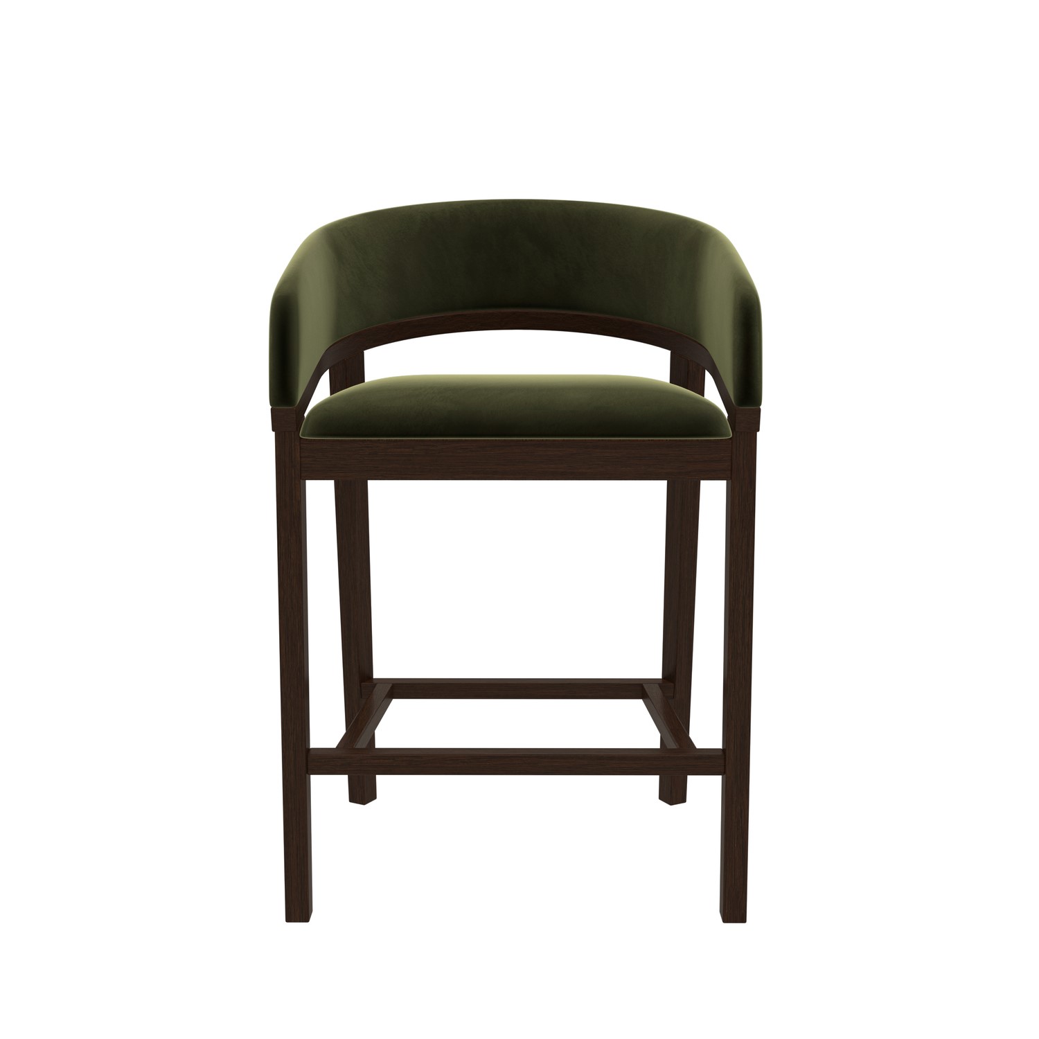 Upgrade your kitchen space with this contemporary curved kitchen stool. Designed with a cut-out backrest and gently curved armrests, it blends modern sophistication with everyday comfort. The soft olive green fabric and plush padding create an inviting seat, whether you're enjoying a quick breakfast or entertaining guests. Supported by a sturdy solid wood frame in a warm walnut-stained finish, this stool not only offers a refined aesthetic but also delivers exceptional durability for daily use.