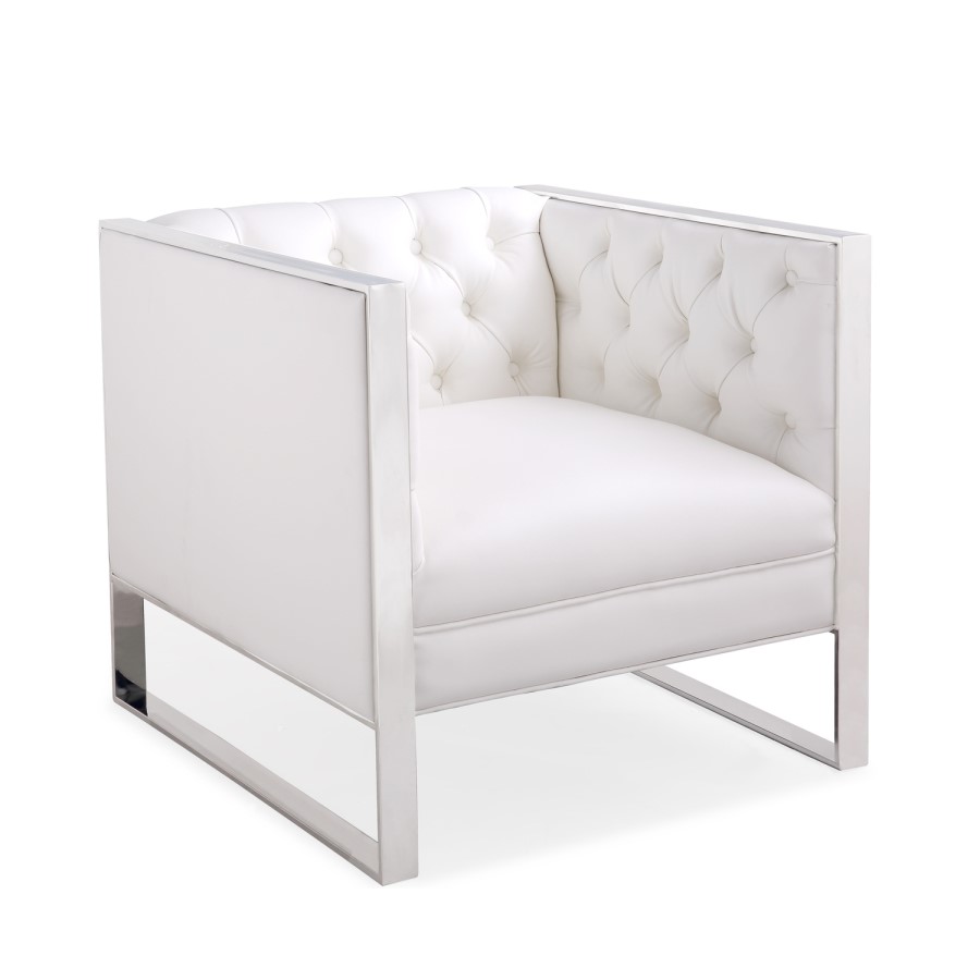 Modern Empire Square Edge Armchair, the essence of this fabulous design is the use of luxuriant materials and perfect finishing, providing the most elegant contemporary atmosphere within the office or home environment. Superbly upholstered with the finest Oyster White Leather Match, along with tufted buttons and Polished Stainless Steel finished frame. The neutral colour of the upholstery makes this modern chair extremely versatile.
