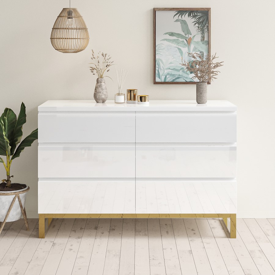 - White high gloss chest of 6 drawers with gold legs