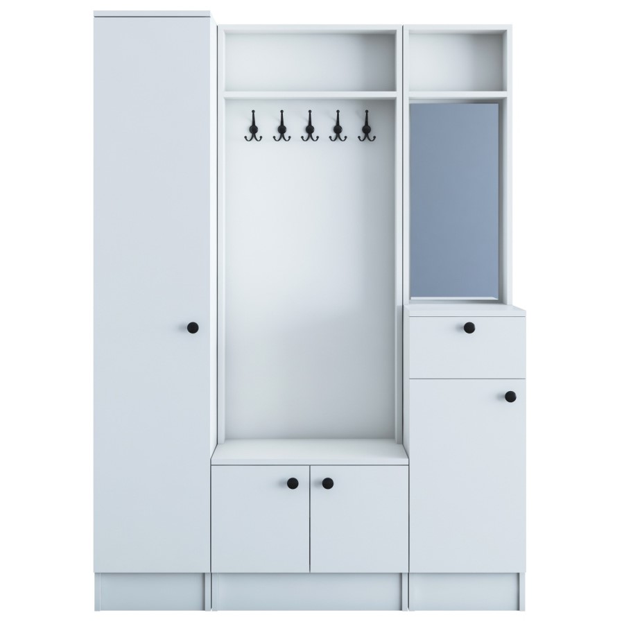 Transform your entryway with this white hall storage hat and coat stand. This hallway unit creates the perfect spot to place your daily items for easy access before heading out the door. Keep your shoes neatly away in the shelves, your coats and hats hooked up and even check your hair one last time before you leave!