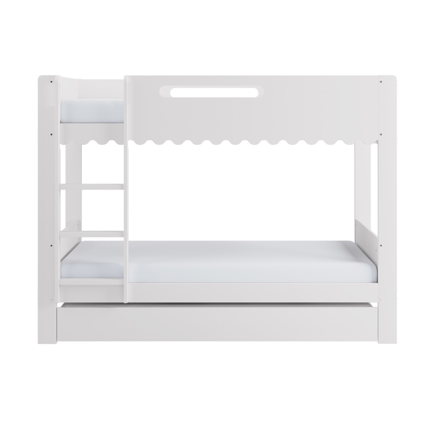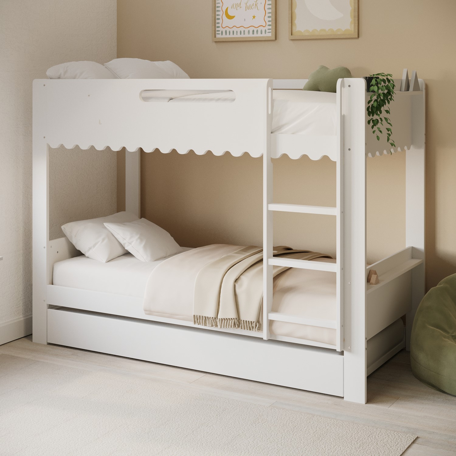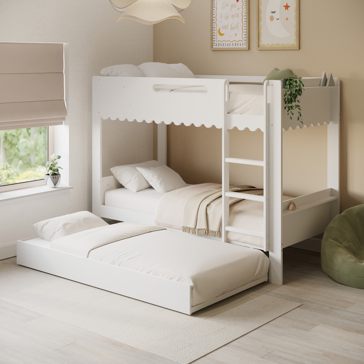 The Gracie Bunk Bed combines playful charm with modern practicality. Its scalloped detailing and softly curved silhouette are finished in a fresh white paint, creating a light, contemporary look. Designed as a space-saving triple sleeper with a pull-out trundle, it’s ideal for shared bedrooms or sleepovers. The fixed ladder, sturdy stairs, and robust guardrails ensure a safe and family-friendly sleep environment. Crafted from durable materials, this bunk bed is built to last.