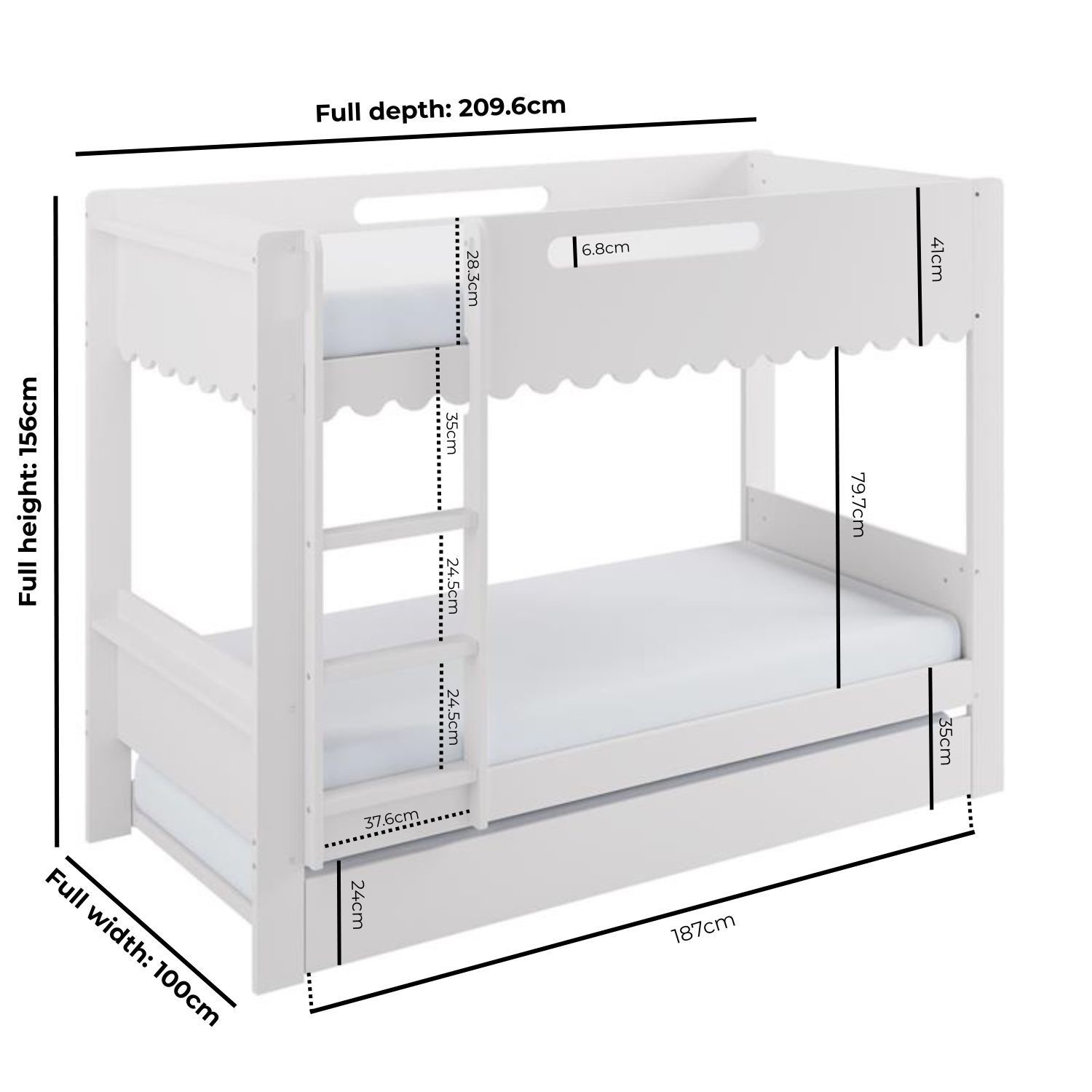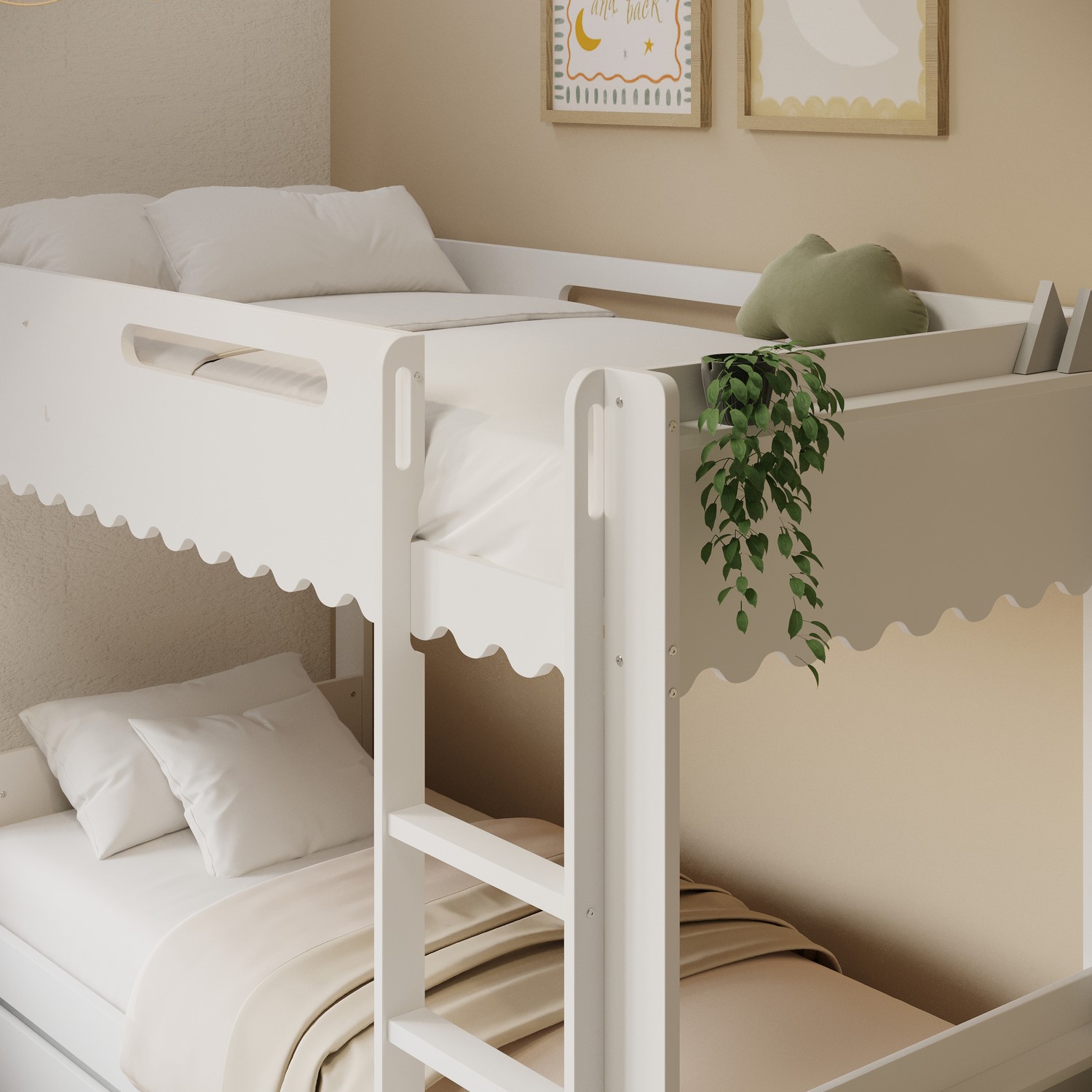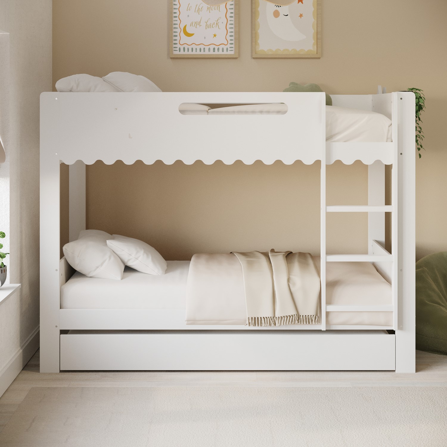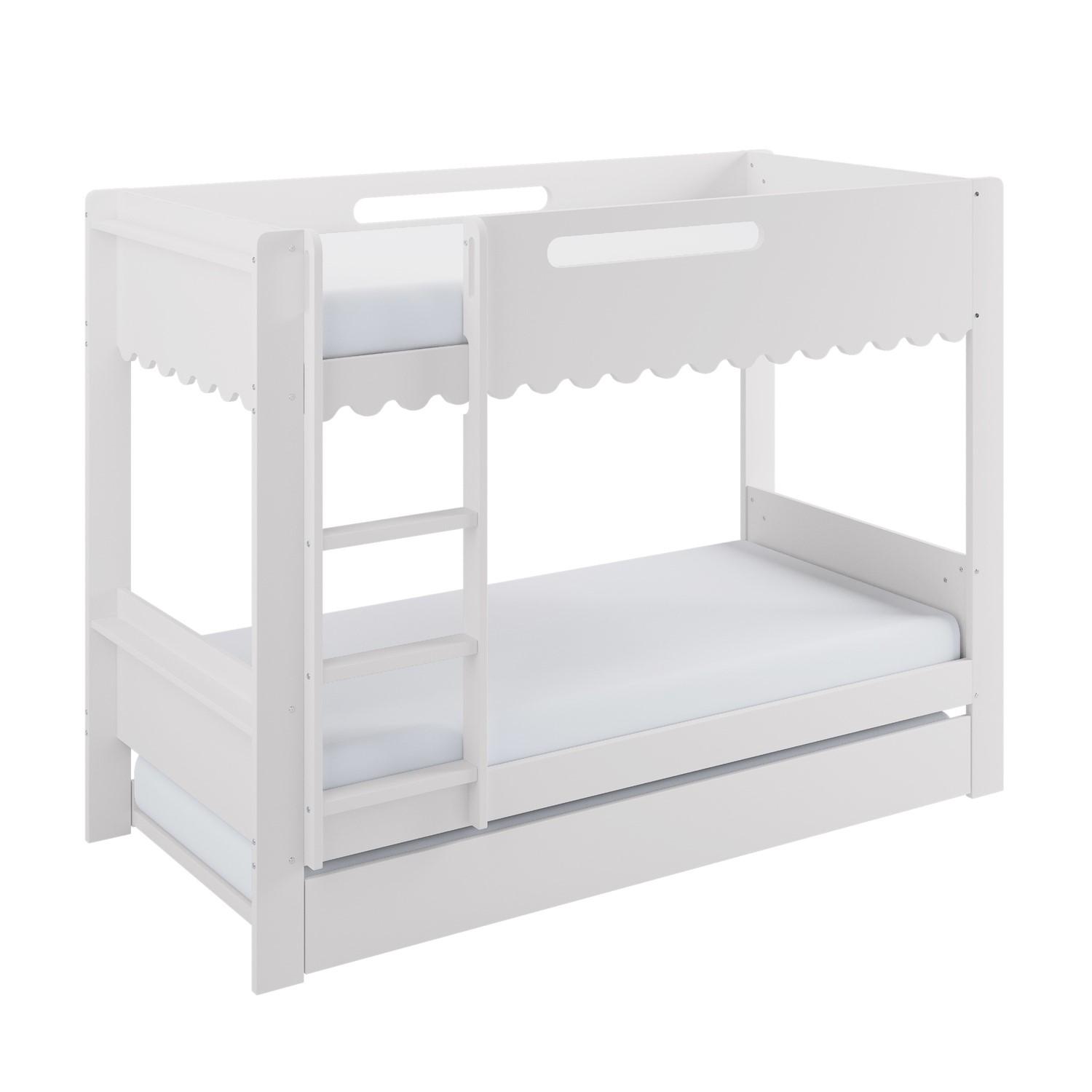 The Gracie Bunk Bed combines playful charm with modern practicality. Its scalloped detailing and softly curved silhouette are finished in a fresh white paint, creating a light, contemporary look. Designed as a space-saving triple sleeper with a pull-out trundle, it’s ideal for shared bedrooms or sleepovers. The fixed ladder, sturdy stairs, and robust guardrails ensure a safe and family-friendly sleep environment. Crafted from durable materials, this bunk bed is built to last.