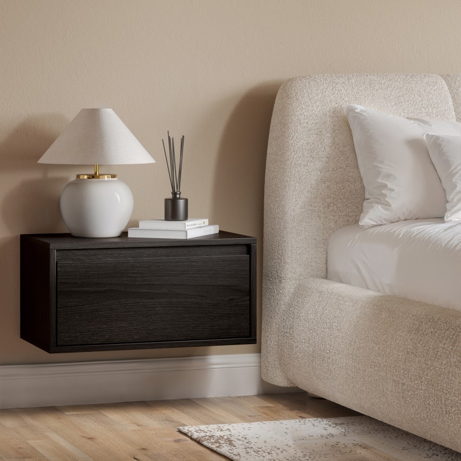 Sleek Floating Design: A wall mounted silhouette that elevates the bedside table, creating a streamlined look while freeing up valuable floor space.