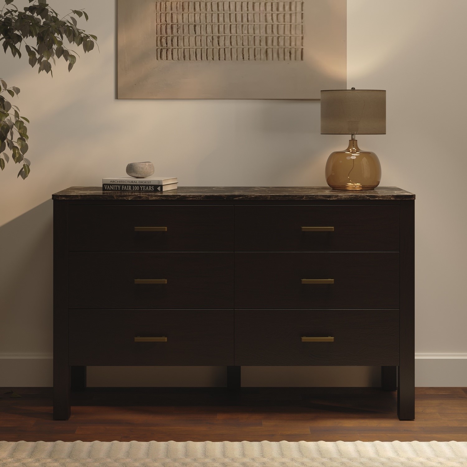 Elevate your living or dining space with the Alessio Sideboard. Crafted from rich, dark-toned mango wood and finished with a smooth marble top, it offers a refined balance of natural beauty and timeless design. Its clean, tailored shape is enhanced by an elegant brass handle, merging exquisite woodwork with refined marble. Handcrafted from natural materials, each piece showcases unique variations, adding to its charm. With six spacious drawers for easy storage, it brings both style and practicality to your space.