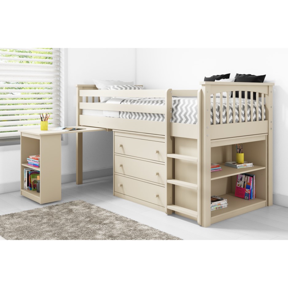 With a simple cream finish, this bed is great for boys and girls, suiting any decoration style and colour. Featuring a raised bed with a reversible ladder, this mid sleeper is perfect for any room layout. Underneath it offers a chest of three drawers and a two shelf bookcase which are both freestanding and can be swapped around for easier access. That also means cleaning is less of a chore too!