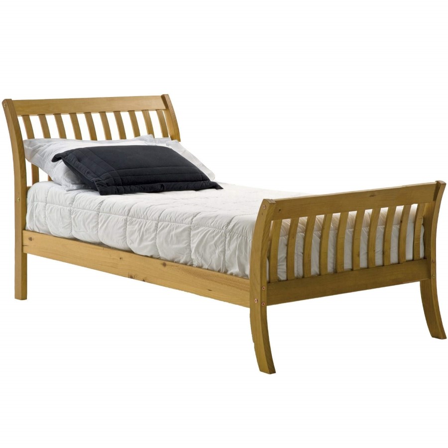 With its distinctive curved headboard and foot end the Parma Small Single Bed Frame in Antique Pine is a compact and eye catching and practical feature for the smaller bedroom. The slats provide support for your mattress whilst there is clearance underneath for storage. With a great antique pine finish this bed is ideal for relaxing in style.