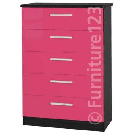 The Hatherley High Gloss 5 Drawer Chest in Black and Pink features a black wood effect top and sides, a plain black top surface and high gloss pink drawer fronts for a stunning modern look. Designed with today's lifestyle in mind, it will offer a handy home for all your folded clothes.
