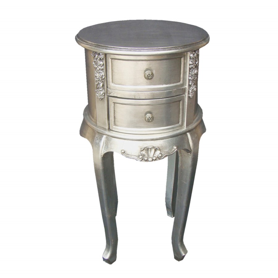 Sophisticated, glamorous and feminine the Dauphine range is a real star. Add that luxurious feel to your room with this beautiful range that has been hand painted in silver leaf. This round night table is a real treasure for the bedroom. Its unusual shape allows it to sit perfectly at your bedside. With two drawers it offers lots of storage for bedside essentials. Decorative features and curving legs add elegance to your bedside.